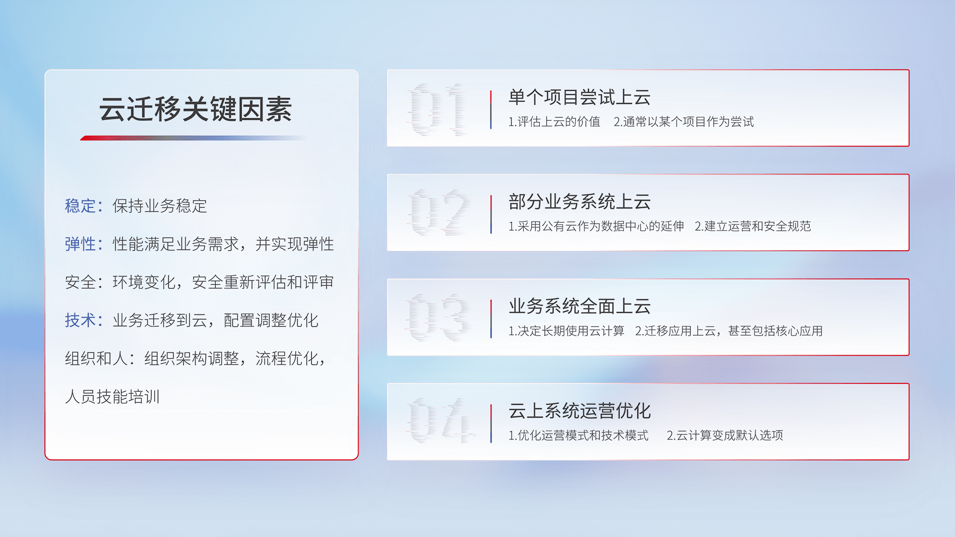 结合实际业务,,,从规划设计、、、、云平台选型、、云原生改造、、、数据迁移、、、、集成交付,,,,迁移全过程为客户识别最佳上云路径,,,做好风险识别管理,,,设计网络架构、、、、身份权限、、、、安全审计合规、、、、操作审计、、、日志审计、、监控告警策略、、、、多站点容灾设计等,,,对云上基础设施进行整体规划,,,,提升IT治理水平,,以满足弹性、、、高可用、、、、高性能的需求。。。。