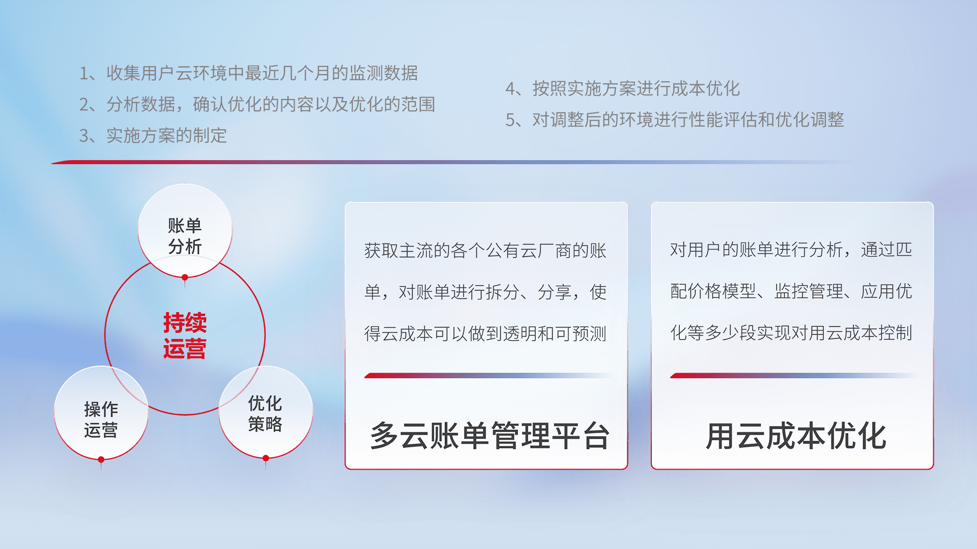 通过灵活运用多种自动化迁移工具,,,帮助企业用户实现业务和数据高效 、、稳定的上云迁移和云上迁移,,,,采用自研多云纳管平台,,,,以中立管理模式,,,解决多组织、、多云、、、多运维厂商的复杂关系的管理,,,,保证多云平台资源配置的一致性,,,,实时掌控云资源运行数据,,,运用智能化工具分析云资源多云平台的管理服务,,,,透明化管理成本支出,,用云成本可预测、、、用云费用可优化、、、云资源配额有据可依。。。。