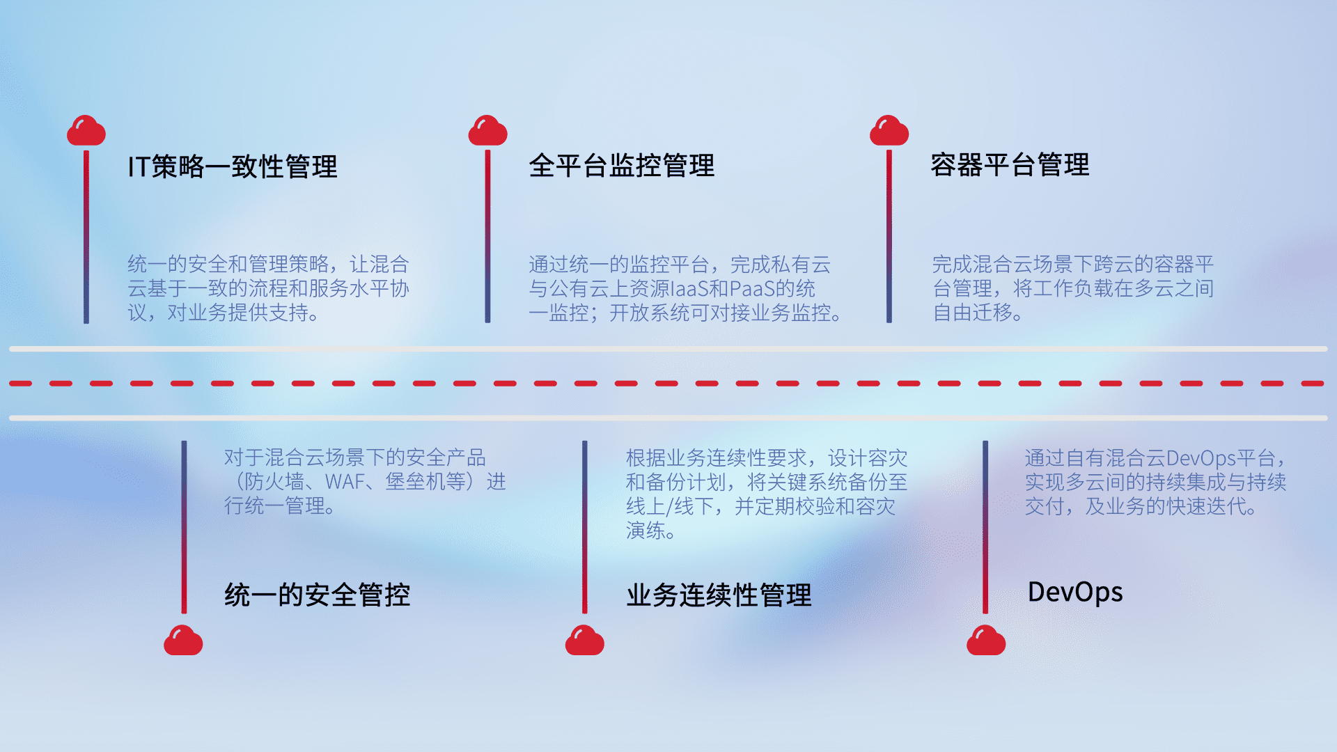 通过多云纳管,,以统一的资源数据模型把客户的云资源进行抽象和封装,,进而实现对多云资源的统一操作,,,,保障云资源管理的可靠性、、稳定性与可用性。。量身定制化运维内容,,,,配置、、、开发运维、、补丁管理、、、、备份、、、、监控、、、认证和访问管理、、、、审计和日常巡检等,,保障在用云过程中的可靠度,,,,稳定度以及高可用率。。。