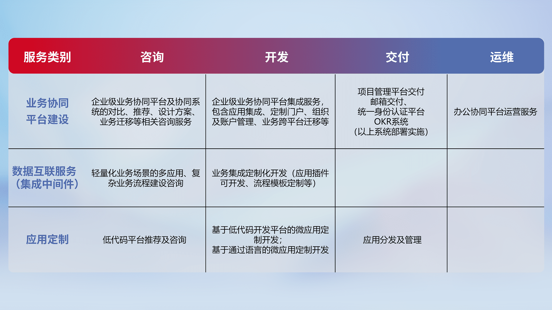 针对钉钉、、企微、、、、IDaas等平台级产品提供产品的规划、、、方案、、、、交付、、定制化开发等服务,,实现如统一协同办公、、智能客户服务、、混合会议管理、、、智能数据查询、、等业务场景,,,实现数字化转型。。。